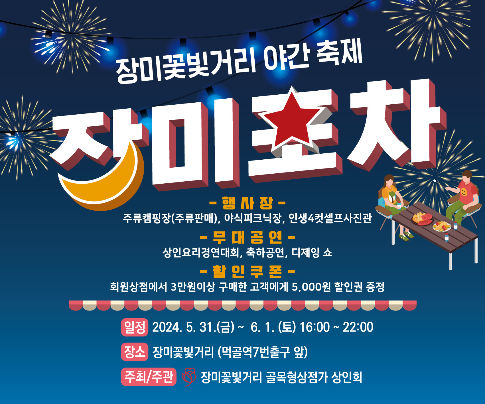 - 주류캠핑장 : 장미꽃빛거리 골목형 상점가 상인이 참여, 판매하는 야시장 운영